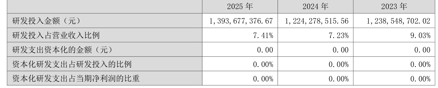 2025年全年,公司研发投入金额为13.94亿元,同比增长13.84%;研发投入占营业收入比例为7.41%,相比上年同期上升0.18个百分点。此外,公司全年研发投入资本化率为0%。