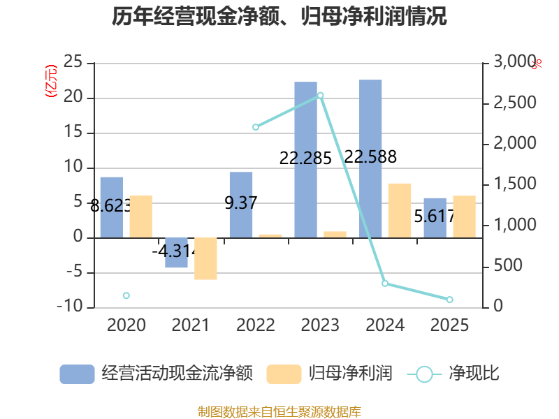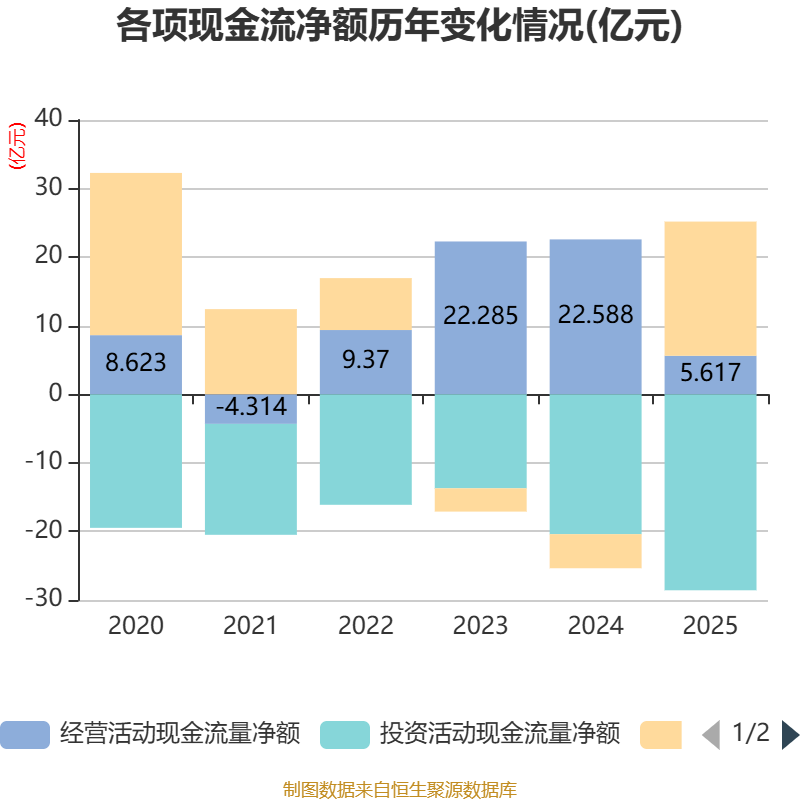 截至2025年,公司经营活动现金流净额为5.62亿元,同比下降75.13%;筹资活动现金流净额19.57亿元,同比增加24.54亿元;投资活动现金流净额-28.58亿元,上年同期为-20.4亿元。
