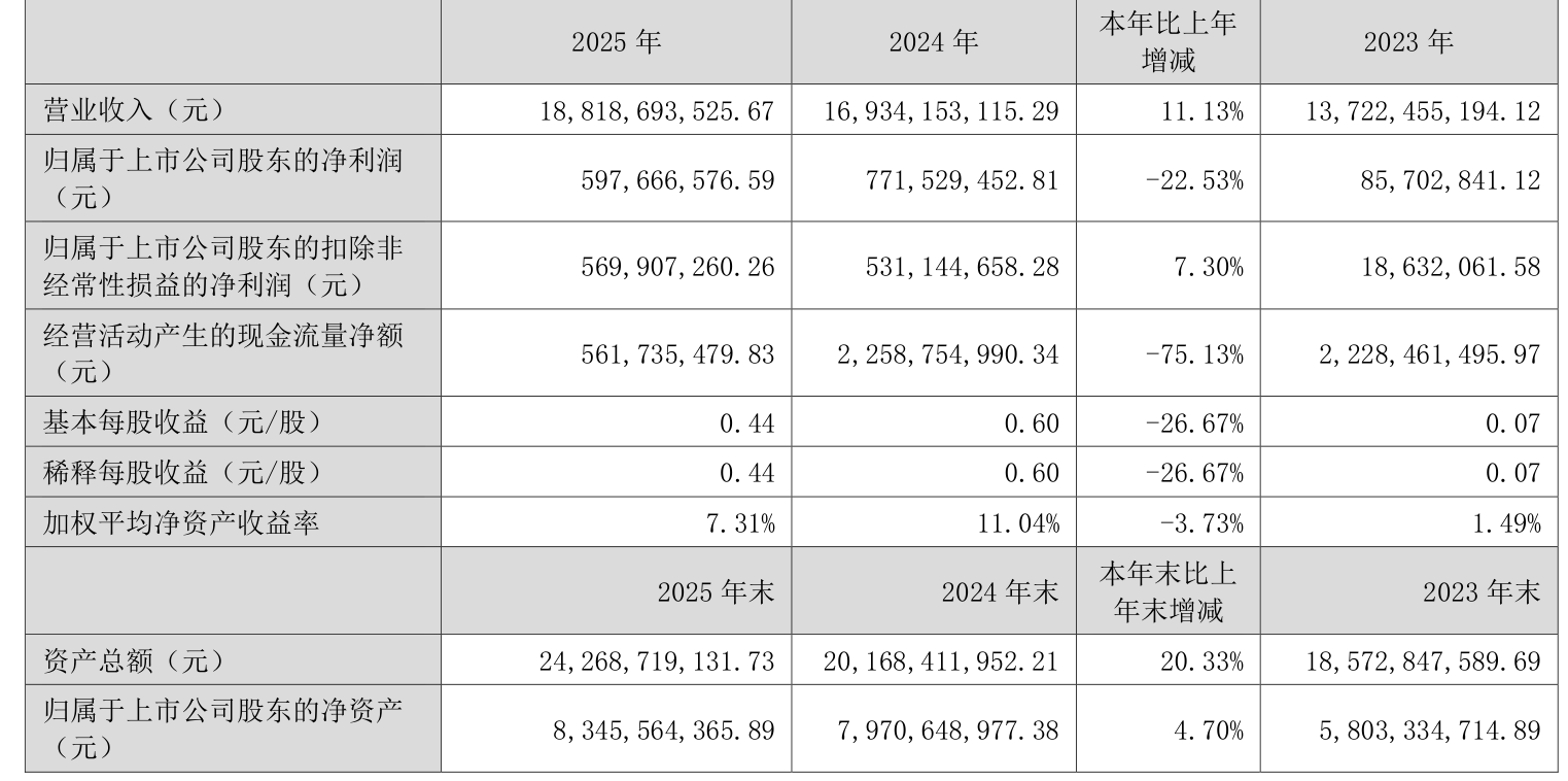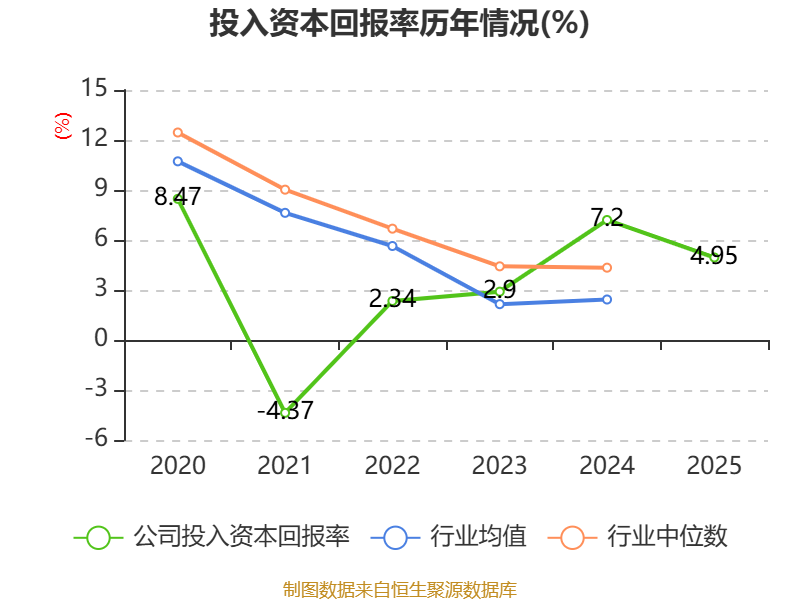 数据显示,2025年公司加权平均净资产收益率为7.31%,较上年同期下降3.73个百分点。公司2025年投入资本回报率为4.95%,较上年同期下降2.25个百分点。