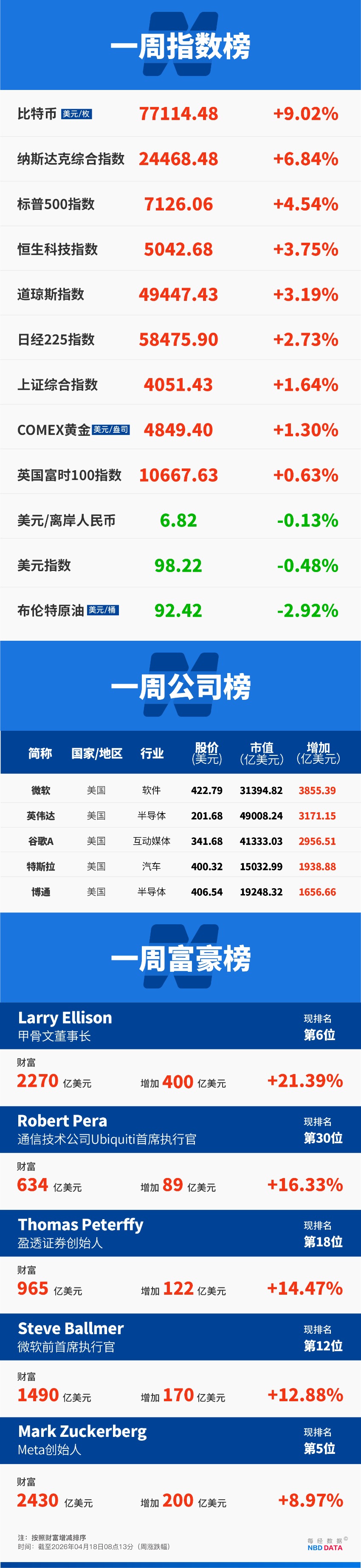 标普500指数本周累计上涨4.54%,报7126.06点,连续三周涨幅超3%,为2020年6月以来首次;纳指本周累计上涨6.84%,报24468.48点,连续上涨13天,创1992年1月以来最长连涨天数;道指本周累计上涨3.19%,报49447.43点,收复美以伊冲突以来所有跌幅。