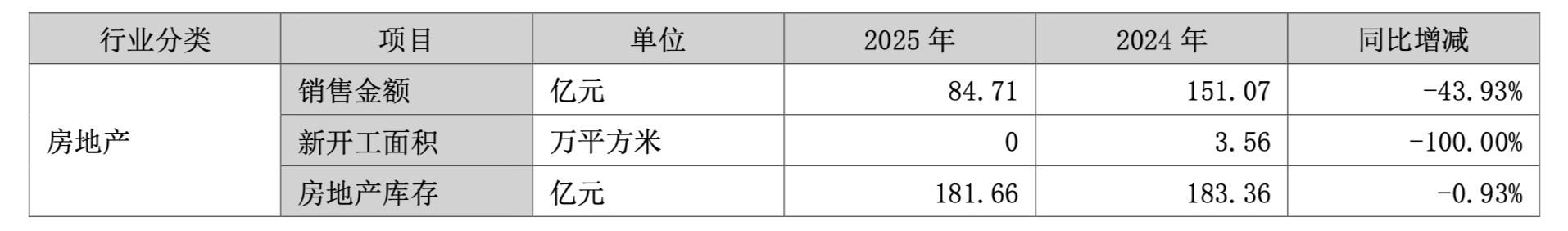 根据年报,2025年,公司房地产销售金额为84.71亿元,同比骤降43.93%;更为刺眼的是,报告期内新开工面积为0万平方米,同比下降100%。