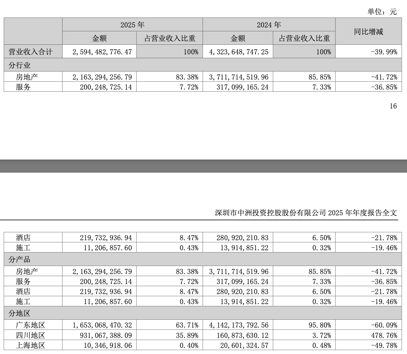 4月17日,中洲控股(000042)发布2025年全年业绩报告,2025年,公司实现营业总收入25.94亿元,同比下降39.99%;归母净利润亏损9.02亿元,上年同期亏损20.25亿元;扣非净利润亏损9.36亿元,上年同期亏损18.63亿元。