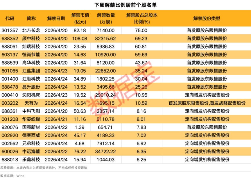 下周A股解禁市值逾600亿元
