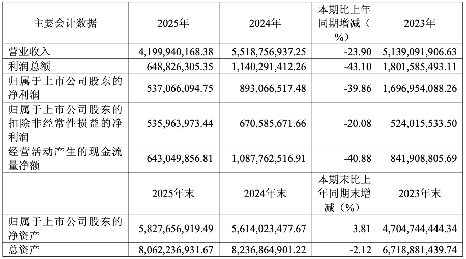 2025年,公司实现营业总收入42亿元,同比下降23.90%;归母净利润5.37亿元,同比下降39.86%;扣非净利润5.36亿元,同比下降20.08%;经营活动产生的现金流量净额为6.43亿元,同比下降40.88%;报告期内,中炬高新基本每股收益为0.7003元,加权平均净资产收益率为9.41%。公司2025年度分配预案为:拟向全体股东每10股派现4.5元(含税)。