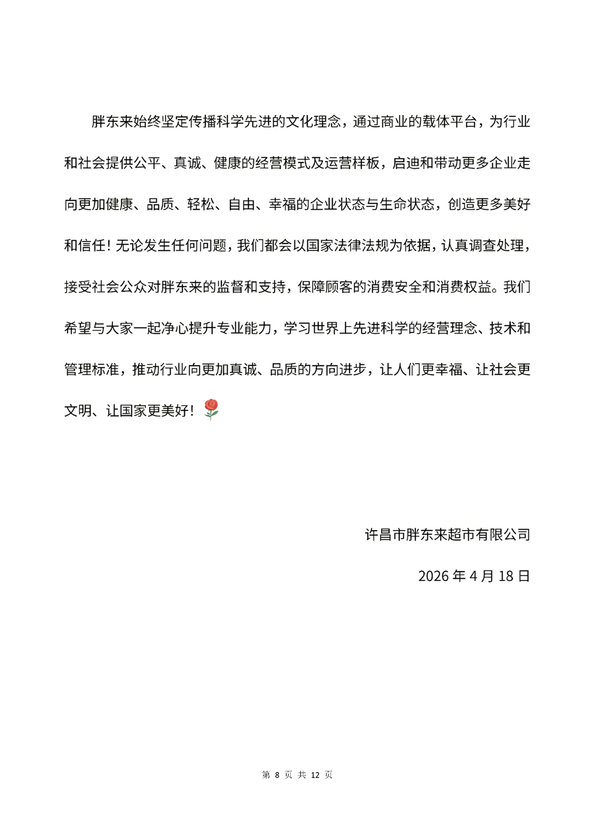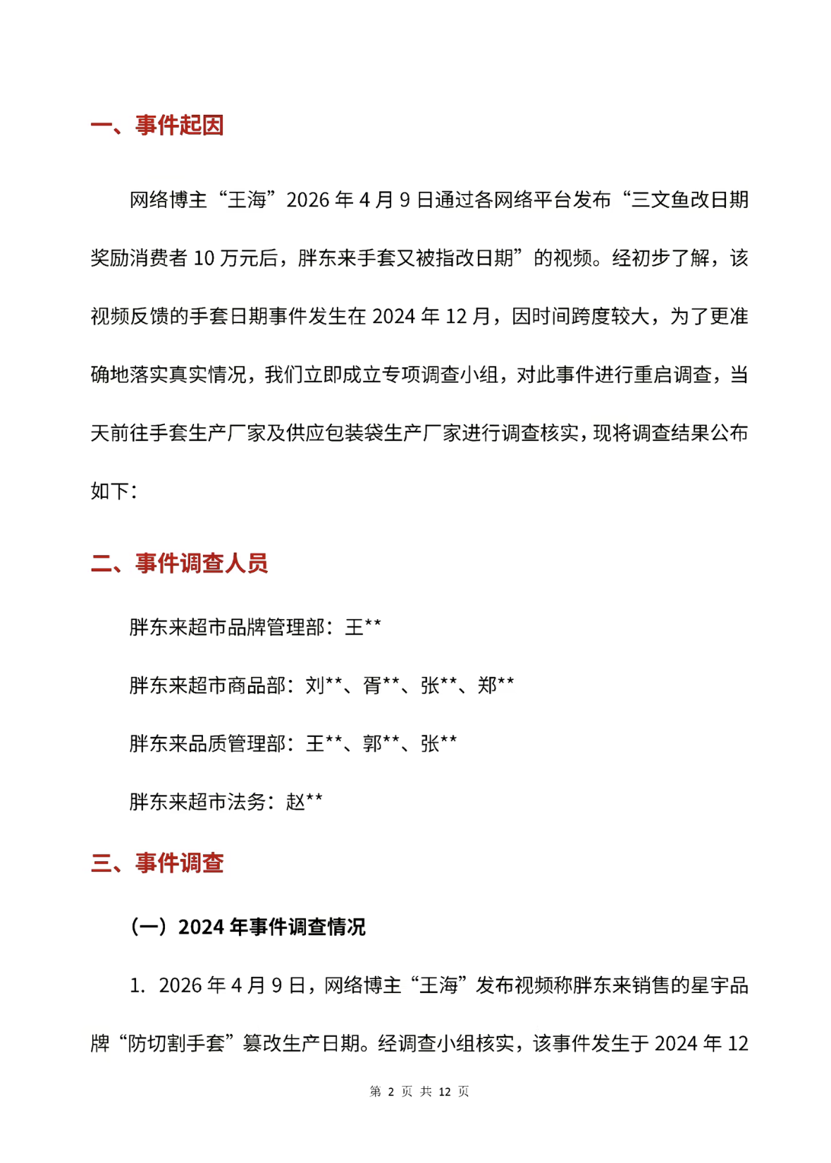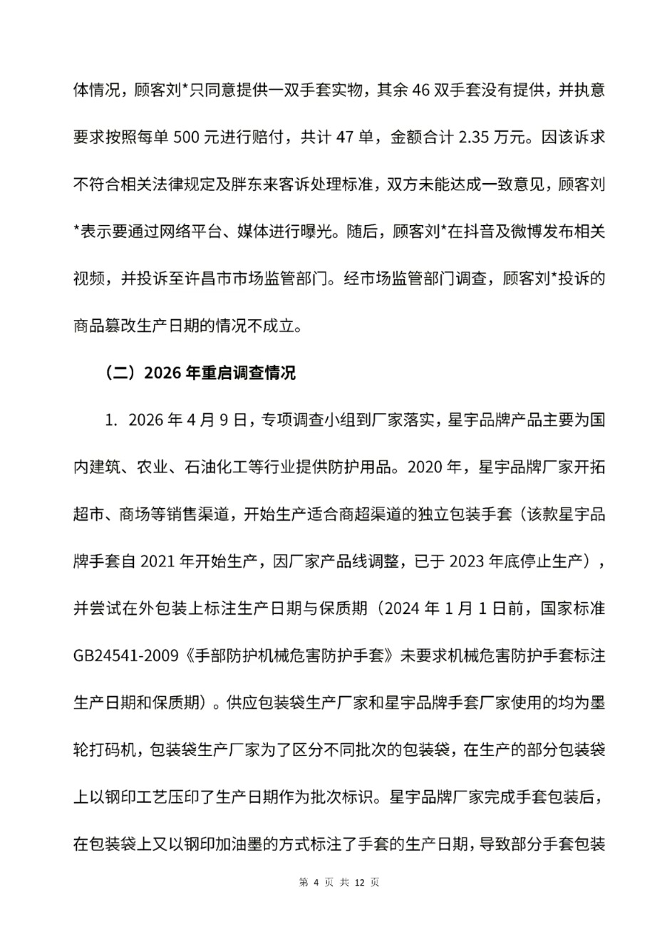 4月18日,胖东来发布《关于王海反馈胖东来销售星宇品牌“防切割手套”篡改日期指控的调查报告》。报告显示,经专项组重启调查,举报所称的篡改日期事实不成立,但该产品存在执行标准失效及日期标注不规范问题,不存在消费欺诈。胖东来决定给予投诉顾客1万元奖励。