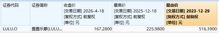 尽管调查事项出现后Lululemon股价未出现大幅波动,但Wind数据显示,截至2026年4月18日,公司股价报167.28美元,较2025年12月的阶段性高点累计下跌25.98%;若与2023年12月的阶段性高点相比,跌幅更是达到67.61%。