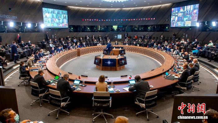 2022年1月7日,北约举行成员国外长特别会议,商讨俄罗斯与乌克兰边境地区局势。北约秘书长斯托尔滕贝格重申,北约仍对俄罗斯奉行“防御+对话”的双轨方针,且在局势紧张之际,“对话更为重要”。图为特别会议会场。中新社发北约供图
