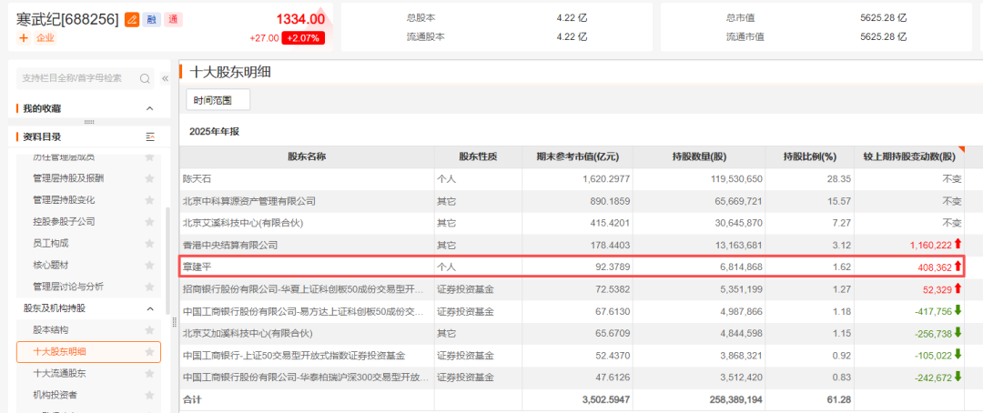 比如,截至2025年末,章建平现身寒武纪前十大股东名单,持股数量为681.5万股,相较2025年三季度末增持40.84万股,期末持股市值达92.4亿元。
