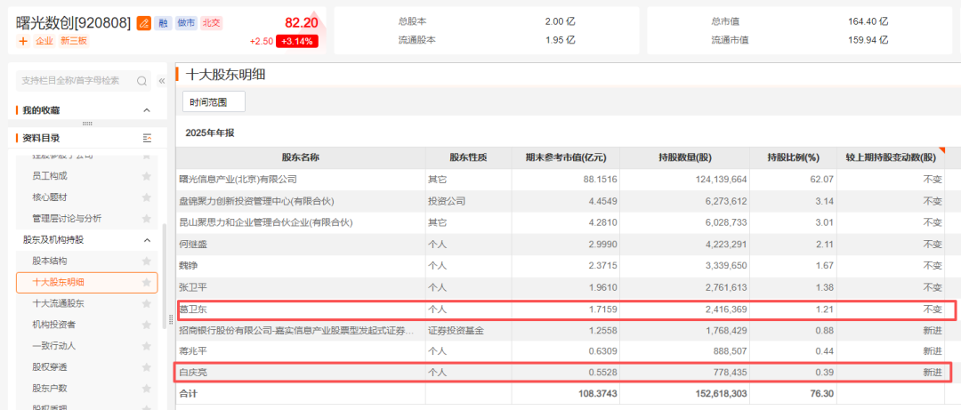 截至2025年末,白庆亮新进曙光数创前十大股东名单,期末持股数量为77.8万股,期末持股市值为0.55亿元。事实上,早在2025年二季度末,白庆亮就出现在曙光数创的前十大股东名单上,彼时持股数量超过90万股,后小幅减持,因此2025年三季度末在公司前十大股东名单上消失。