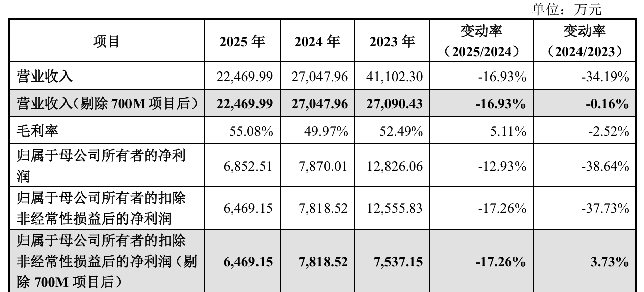 业绩方面,2023年至2025年(下称“报告期”),公司营业收入分别为4.11亿元、2.7亿元和2.25亿元,下滑态势显著;扣非净利润为1.26亿元、7818.52万元和6469.15万元,分别同比下滑37.73%、17.26%。
