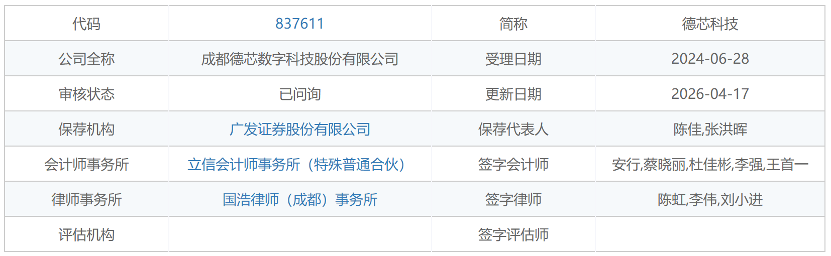4月17日,据北交所官网,成都德芯数字科技股份有限公司(下称“德芯科技”)回复第三轮问询函,公司连续两年业绩下滑、下滑趋势是否扭转,收入确认准确性等情况受到监管层的进一步关切。