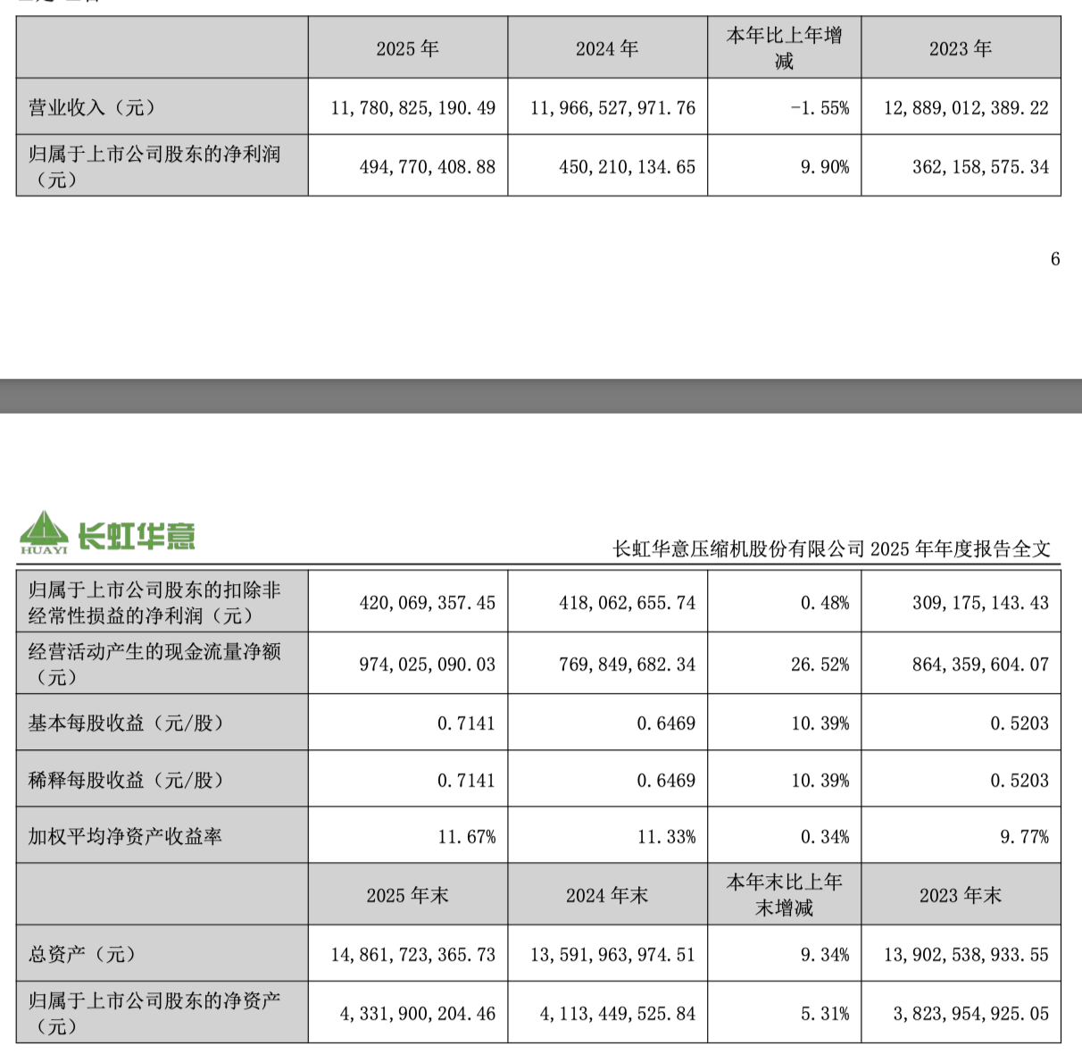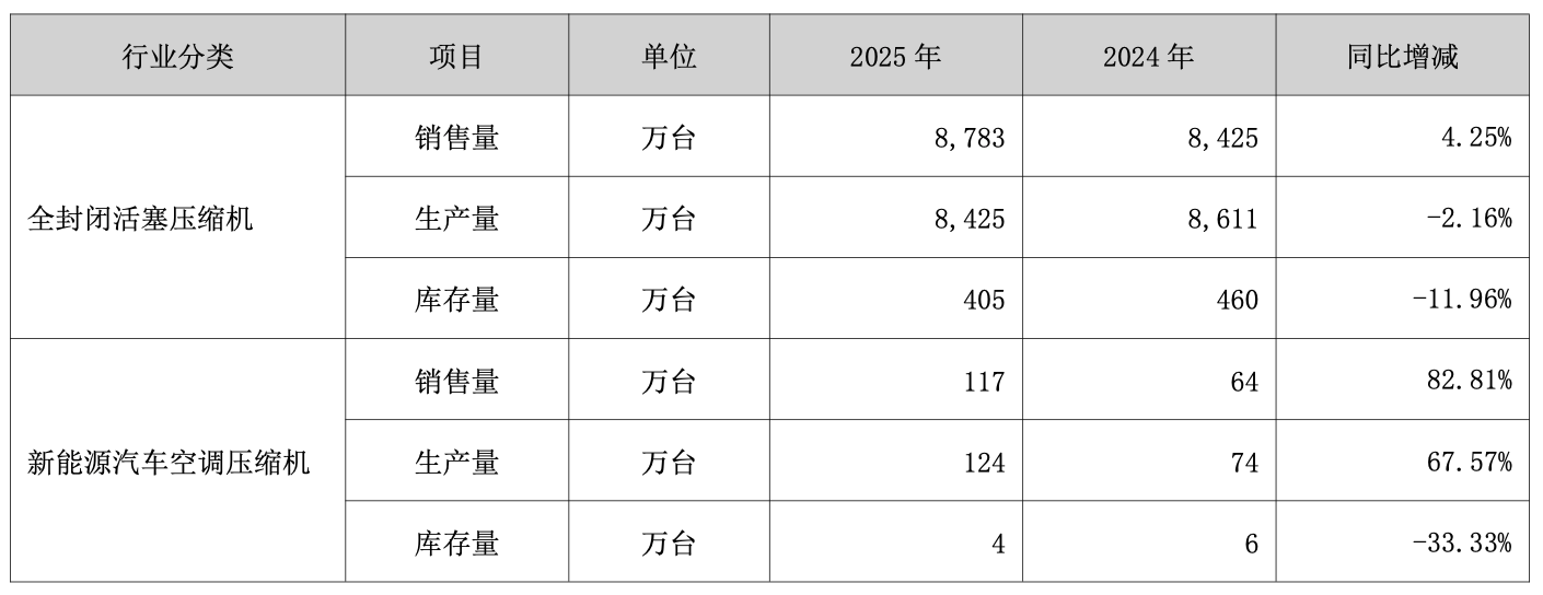 长虹华意在年报中披露2026年主要经营目标:全封闭活塞压缩机产销量目标9000万台,力争9500万台;新能源汽车空调压缩机产销量目标120万台,力争150万台;销售收入目标118亿元,力争125亿元。