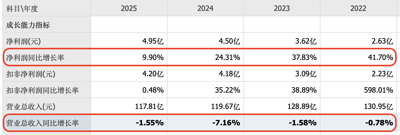记者留意到,长虹华意“减收增利”的情况已经持续了四年,2022年~2025年,公司营收分别下滑0.78%、1.58%、7.16%、1.55%,净利润则分别增长41.7%、37.83%、24.31%、9.9%。不过,其净利的增速出现显著放缓。