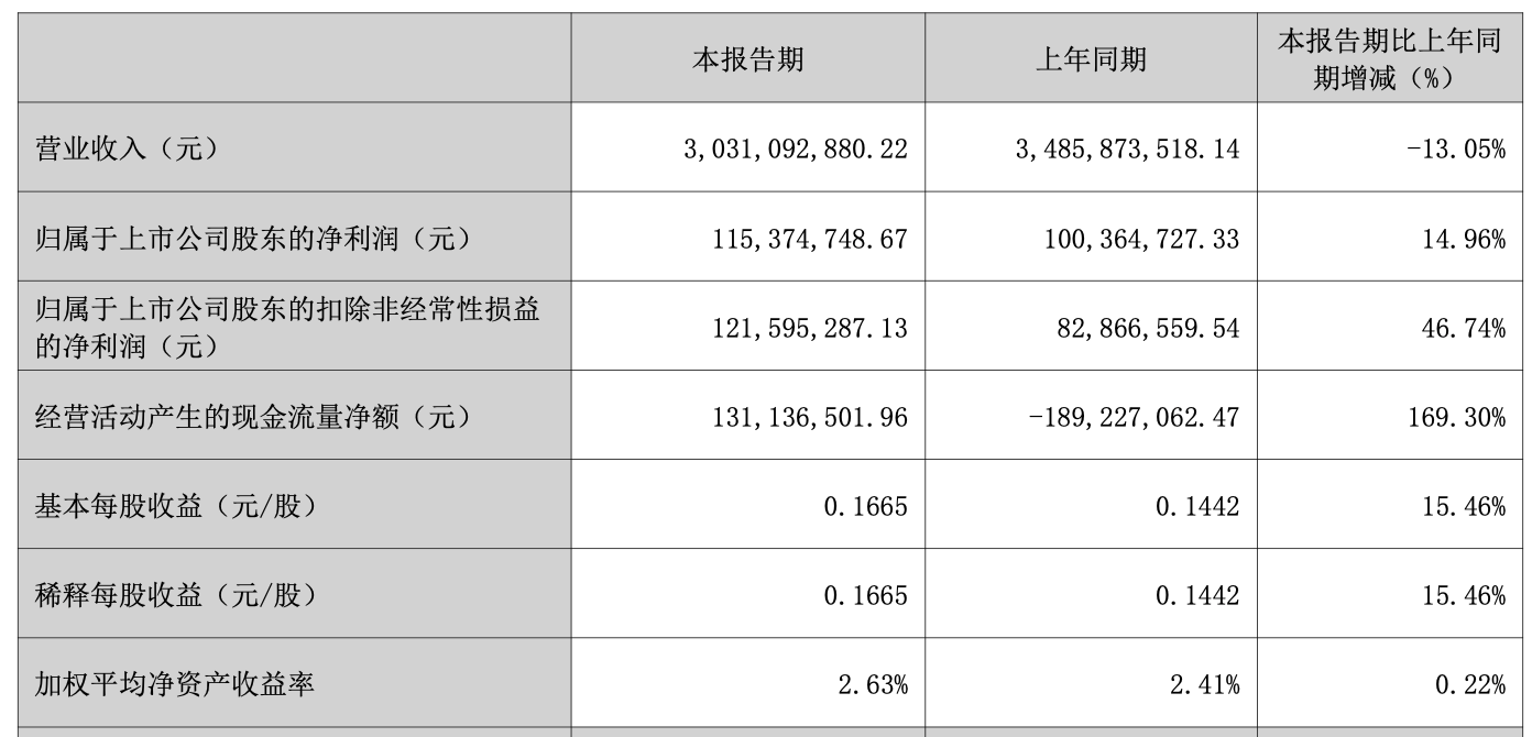 今年一季度,公司实现营业总收入30.31亿元,同比下降13.05%;归母净利润1.15亿元,同比增长14.96%;扣非净利润1.22亿元,同比增长46.74%;经营活动产生的现金流量净额为1.31亿元,上年同期为-1.89亿元。