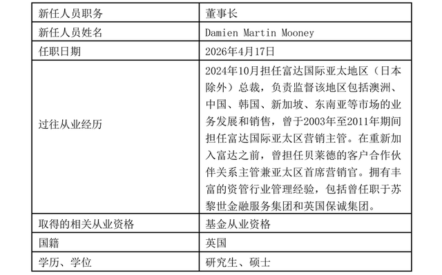 4月18日,富达基金管理(中国)有限公司(下称“富达基金”)发布关于董事长变更的公告。根据公告,富达基金原董事长李少杰因工作调整,已于4月17日离任,莫达文(Damien Martin Mooney)被任命为公司新任董事长。