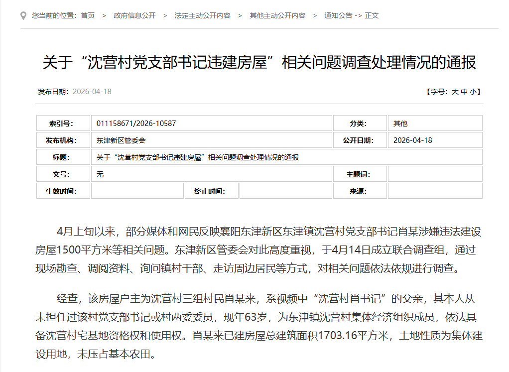 4月18日,襄阳东津新区管委会官网发布关于“沈营村党支部书记违建房屋”相关问题调查处理情况的通报,全文如下: