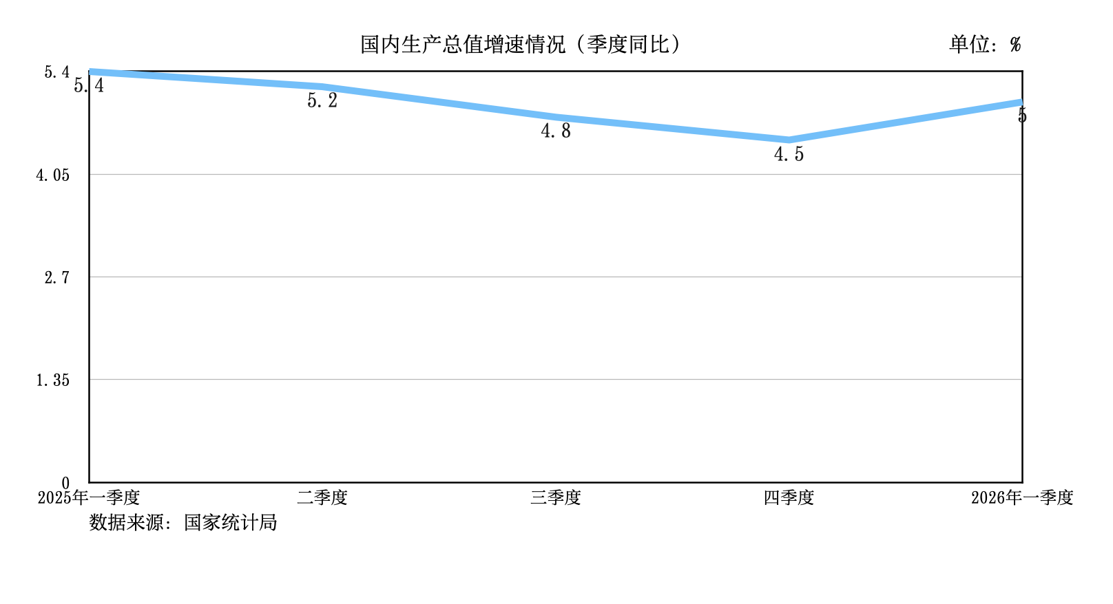 在“十五五”规划的开局之年,中国经济交出了一份十分亮眼的答卷。国家统计局公布的最新数据显示,2026年一季度国内生产总值同比增长5.0%,显著高于去年四季度的4.5%。