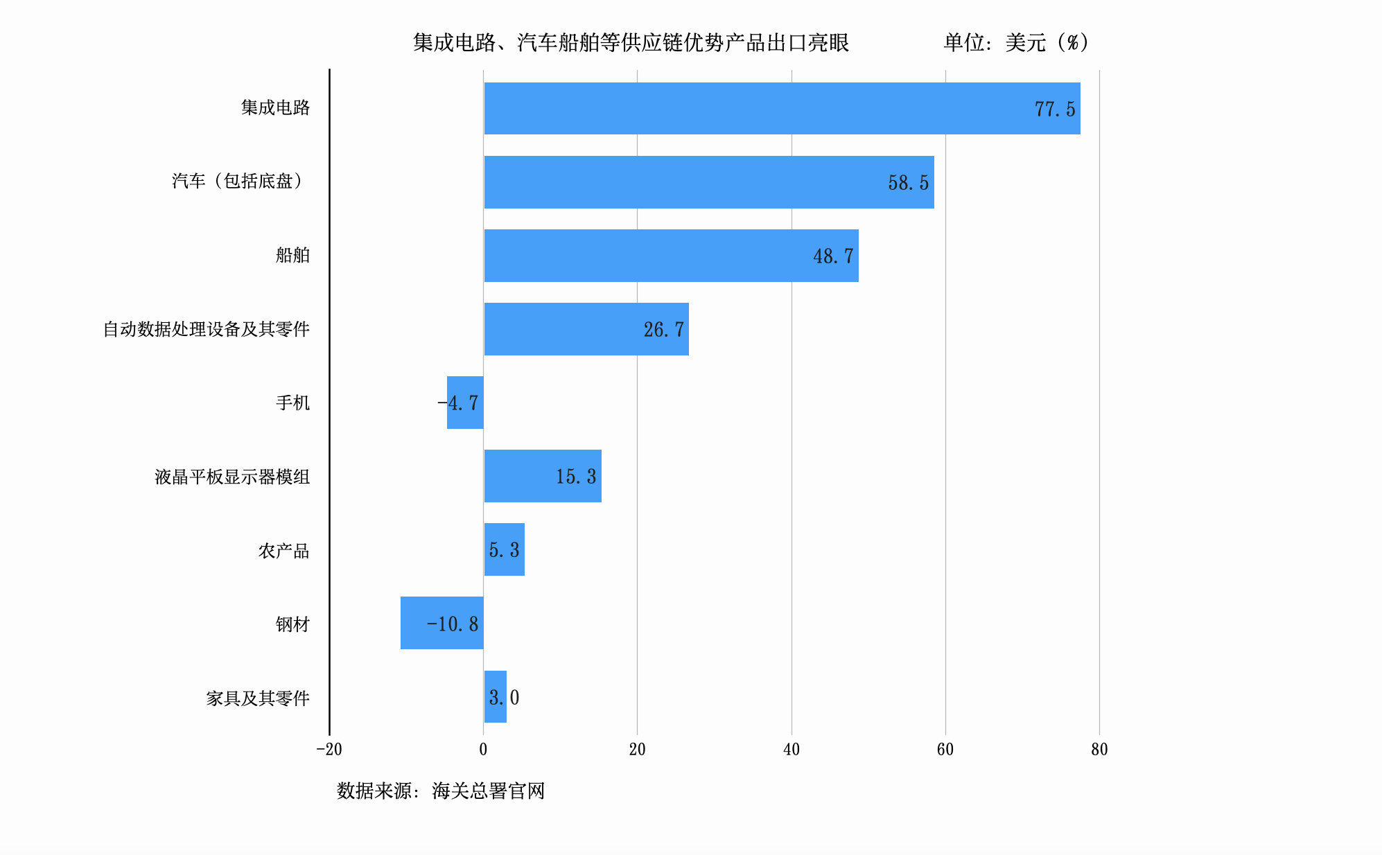 国联民生证券首席经济学家陶川对界面新闻分析称,当前在全球生产与供应链受阻的环境下,我国完整产业链和能源自主优势将进一步强化,从而吸纳更多的订单转移,集成电路、汽车船舶以及“新三样”等产品出口有望继续保持高增长态势。