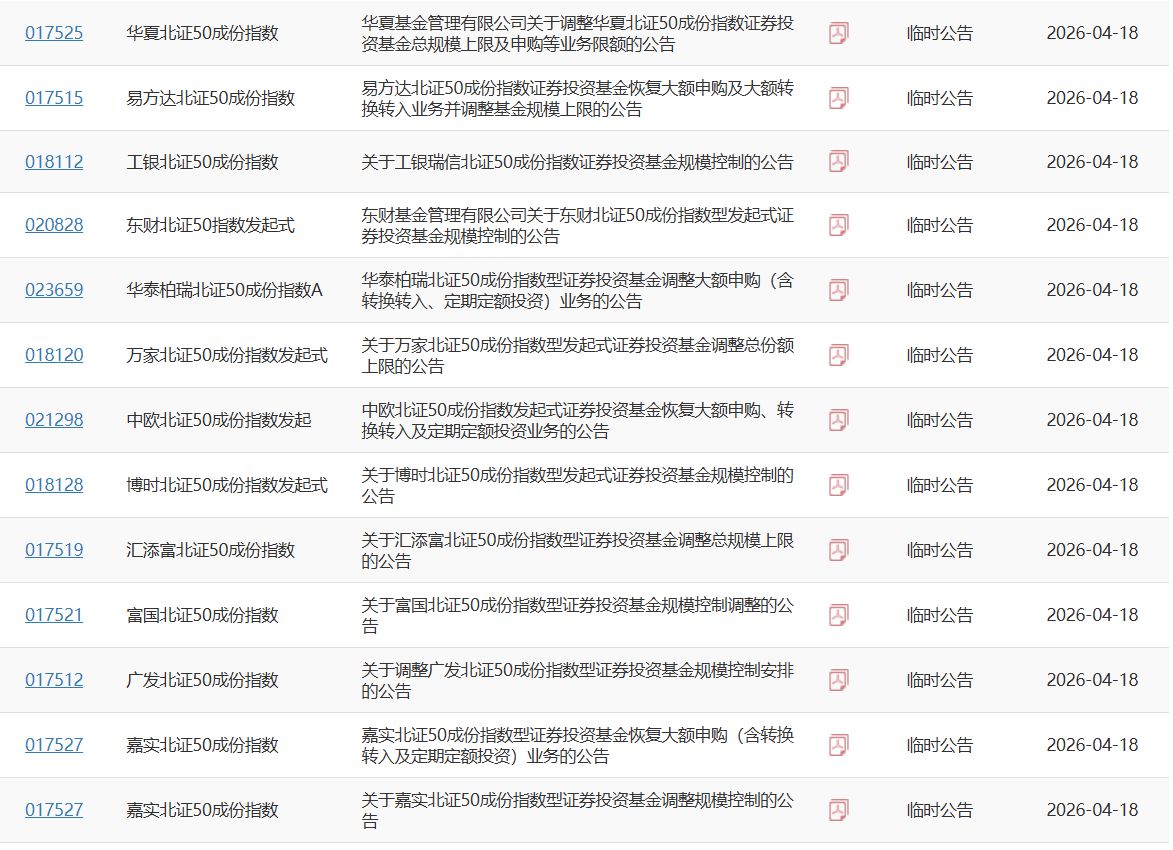 还有中欧北证50成份指数发起式基金,自2026年4月20日(含)起,取消单日单个基金账户的单笔或多笔申购、转换转入及定期定额投资业务金额的限制;嘉实北证50成份指数基金,也取消此前设置的申购限制,恢复办理基金的正常申购(含转换转入及定期定额投资)业务。