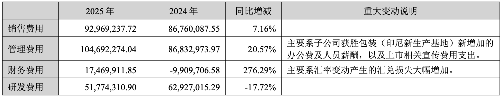 报告期内,公司管理费用同比增长20.57%,主要系子公司获胜包装(印尼新生产基地)新增加的办公费及人员薪酬,以及上市相关宣传费用支出。财务费用同比增长276.29%,主要系汇率变动产生的汇兑损失大幅增加。