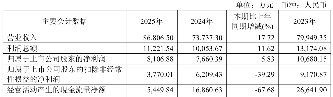 日前,八亿时空(688181)发布2025年业绩报告。数据显示,公司2025年营业收入8.68亿元,同比增长17.72%;归母净利润8106.88万元,同比增长5.83%;扣非净利润3770.01万元,同比下降39.29%。