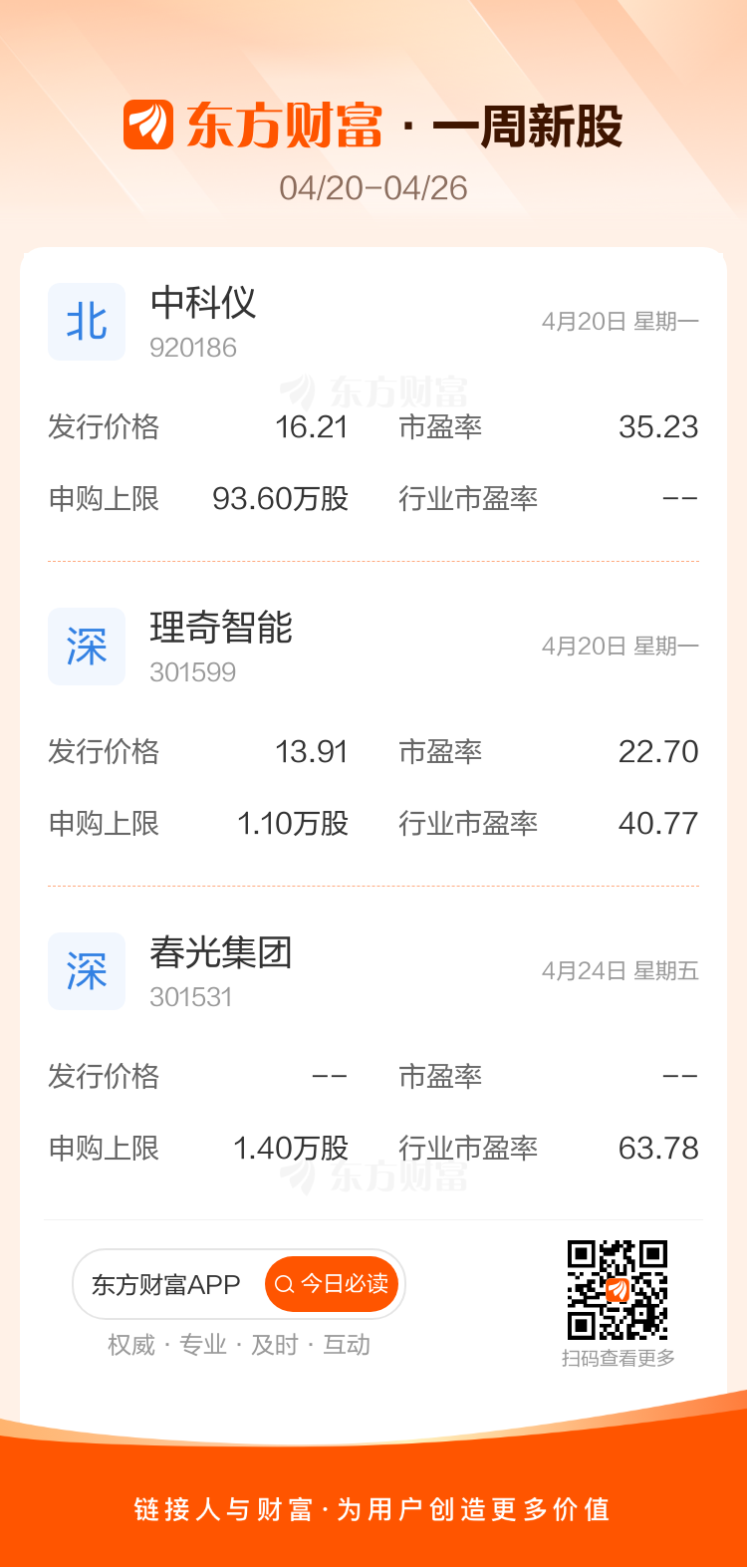 下周(4月20日至4月26日)沪深北三市有3只新股申购,分别为中科仪、理奇智能、春光集团。
