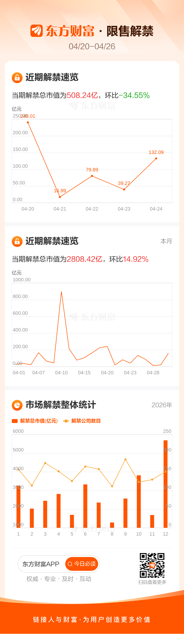 下周(4月20日至4月26日)有38家公司限售股陆续解禁,当期解禁总市值为508.24亿元,-34.55%。
