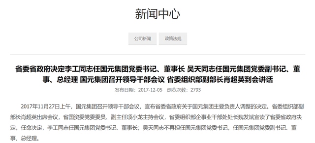 2017年11月27日,国元集团召开领导干部会议,宣布省委省政府关于国元集团主要负责人调整的决定。吴天不再担任国元集团党委书记,任国元集团党委副书记、董事、总经理。