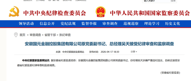 4月17日,中央纪委国家监委网站发布消息,据安徽省纪委监委消息:安徽国元金融控股集团有限公司(下称:国元集团)原党委副书记、总经理吴天涉嫌严重违纪违法,目前正接受安徽省纪委监委纪律审查和监察调查。