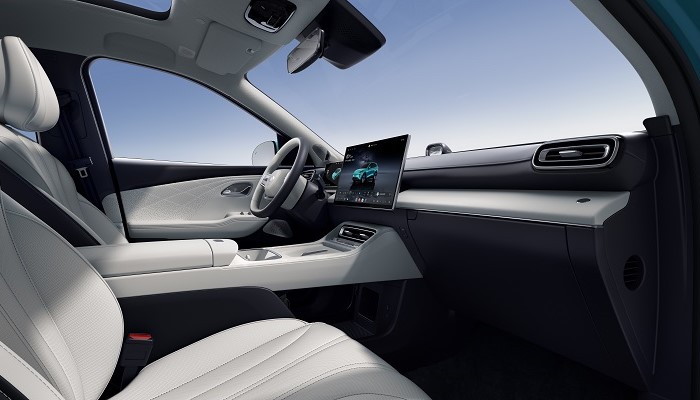座舱采用当前较常见的简洁布局,配备液晶仪表、悬浮式中控屏和平底双辐方向盘,并使用怀挡机构提升中控区域的空间利用率。车机部分搭载8678芯片,首发风云UI 2.0,支持语音交互和多品牌手机互联。车内采用5座布局,前排配备双零重力座椅,支持较完整的电动调节、通风、加热和按摩功能,后排也提供电动调节、通风和加热,高配车型进一步加入后排吸顶屏和23扬声器音响。