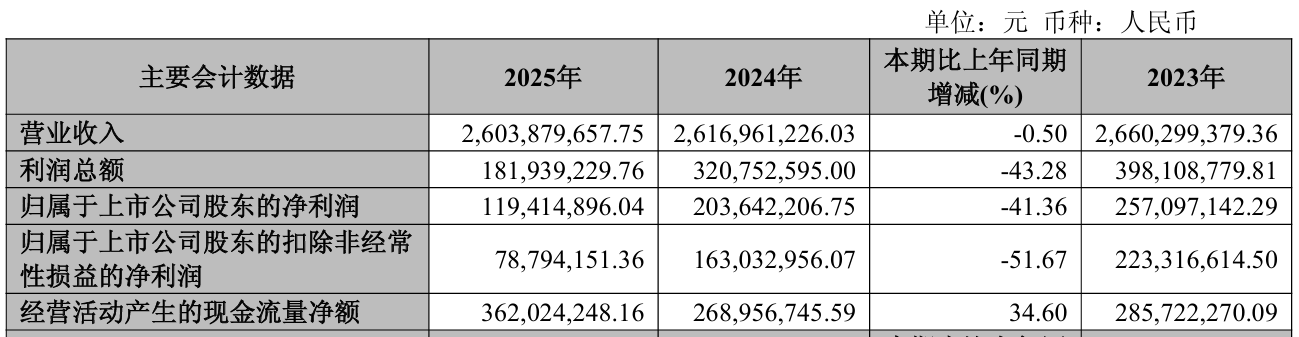4月17日,国检集团(603060)发布2025年业绩报告。数据显示,公司2025年实现营业收入26.04亿元,同比减少0.50%;归母净利润1.19亿元,同比减少41.36%;扣非净利润7879.42万元,同比减少51.67%,创下公司上市以来新低。