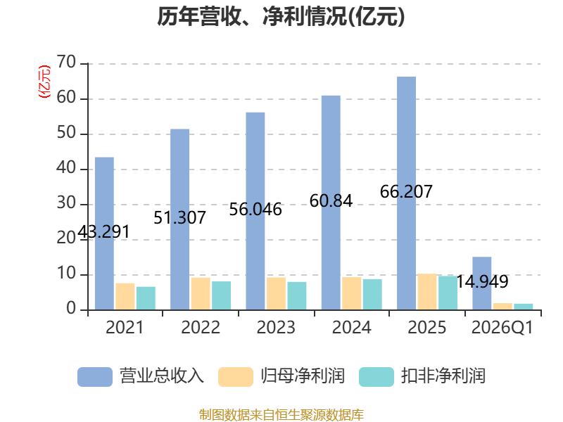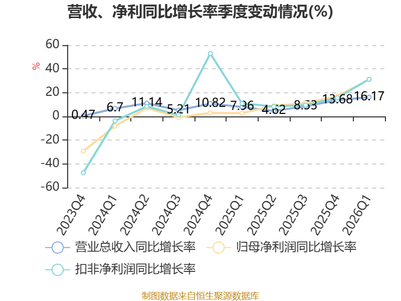 一季报显示,2026年一季度末的公司十大流通股东中,新进股东为广发多因子灵活配置混合型证券投资基金、基本养老保险基金一六零五二组合,取代了上年末的嘉实成长共享混合型证券投资基金、基本养老保险基金八零七组合。在具体持股比例上,香港中央结算有限公司、全国社保基金六零二组合持股有所上升,易方达创业板交易型开放式指数证券投资基金、嘉实新兴产业股票型证券投资基金、中证500交易型开放式指数证券投资基金持股有所下降。