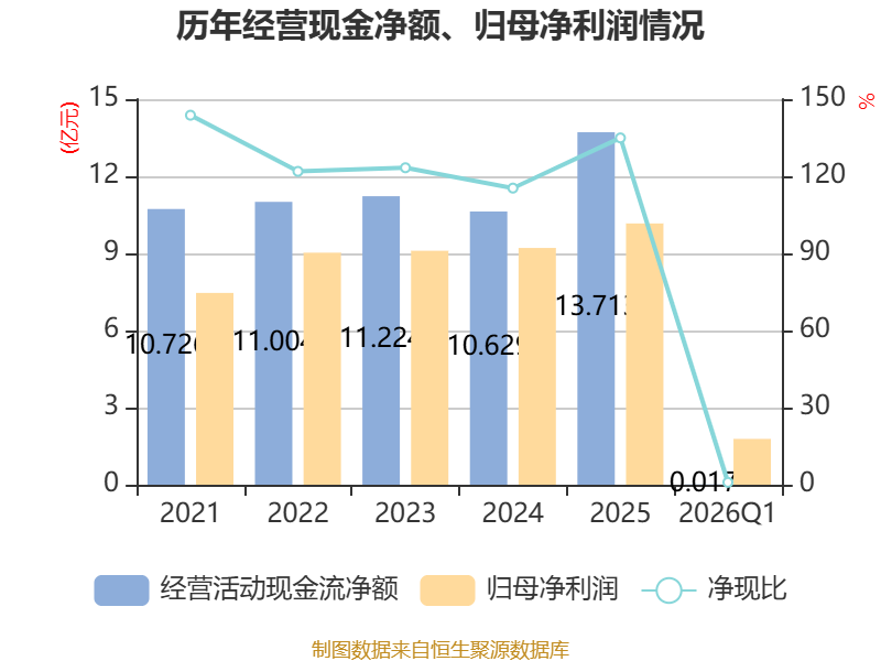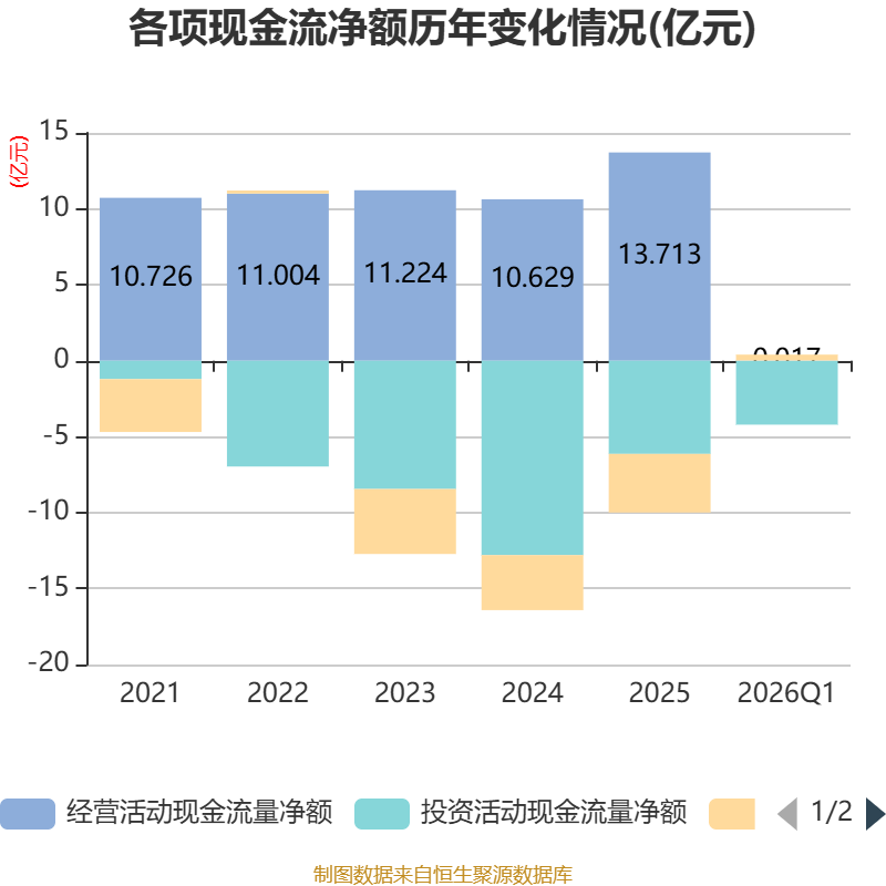 截至2026年一季度末,公司经营活动现金流净额为165.56万元,同比增加9159.09万元;筹资活动现金流净额3852.5万元,同比增加9822.98万元;投资活动现金流净额-4.21亿元,上年同期为-1686.41万元。