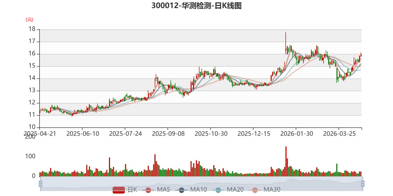 中证智能财讯华测检测(300012)4月20日披露2026年第一季度报告。公司实现营业总收入14.95亿元,同比增长16.17%;归母净利润1.78亿元,同比增长30.93%;扣非净利润1.64亿元,同比增长31.28%;经营活动产生的现金流量净额为165.56万元,上年同期为-8993.53万元;报告期内,华测检测基本每股收益为0.1066元,加权平均净资产收益率为2.30%。