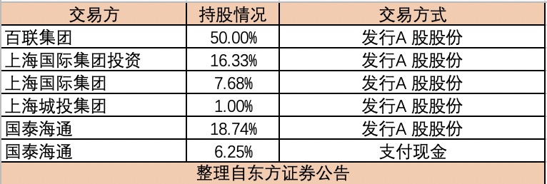 交易初步确定的发行股份及支付现金购买资产交易对方有5家,合计持有上海证券100%股份。分别为百联集团有限公司(以下简称“百联集团”)、国泰海通证券股份有限公司(以下简称“国泰海通”)、上海国际集团投资有限公司(以下简称“上海国际集团投资”)、上海国际集团有限公司(以下简称“上海国际集团”)、上海城投(集团)有限公司(以下简称“上海城投集团”)。