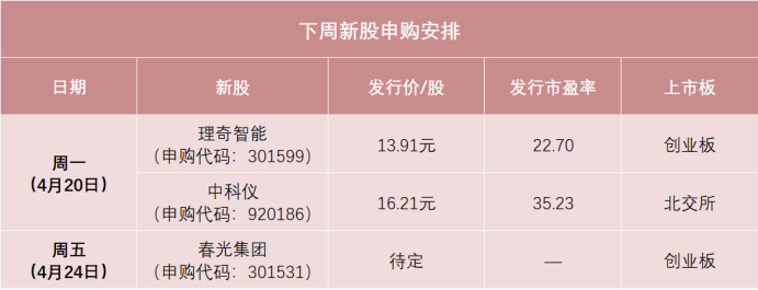 日程安排上,周一(4月20日)可申购创业板新股理奇智能、北交所新股中科仪,周五(4月24日)可申购创业板新股春光集团。
