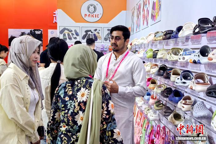 4月19日,海外客商在福建晋江举办的第二十七届中国(晋江)国际鞋业暨体育产业博览会上洽谈对接。中新网记者孙虹摄
