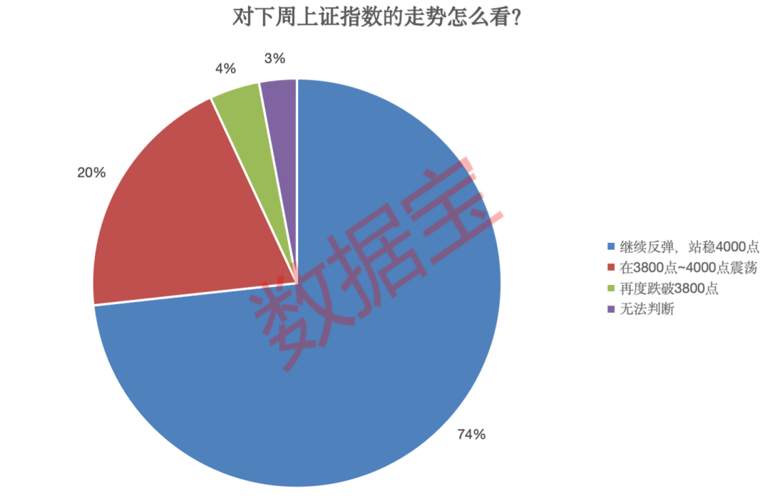 本周A股震荡走高,多数受访者认为下周市场将延续涨势。调查数据显示,74%的受访者认为下周市场将“继续反弹,站稳4000点”,为最主流观点;20%的受访者认为下周市场将“在3800点~4000点震荡”;仅有4%的受访者明确看空下周市场。