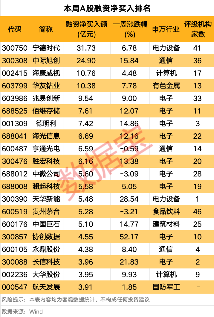 个股方面,剔除近期上市个股后,本周37股融资净买入额在3亿元以上。锂电龙头宁德时代、中际旭创、海康威视、华友钴业净买入额排名前四,依次为31.73亿元、24.90亿元、10.76亿元、10.38亿元。