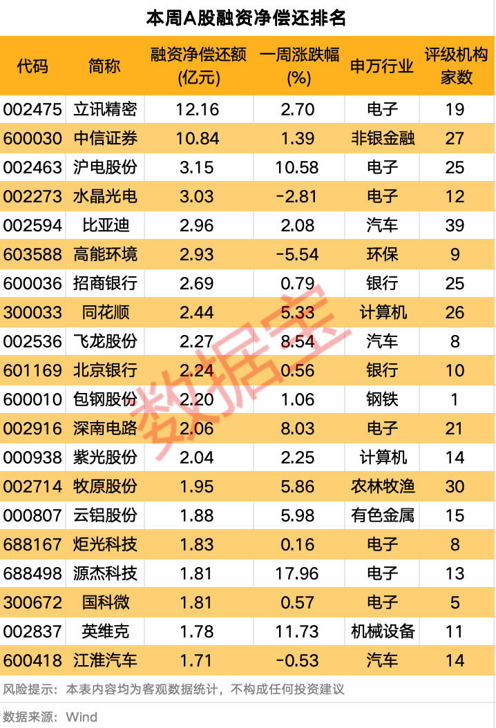 41股融资净偿还额超过1亿元。立讯精密和中信证券净偿还额均超过10亿元,分别为12.16亿元、10.84亿元;沪电股份、水晶光电随后,融资净偿还额均在3亿元以上。