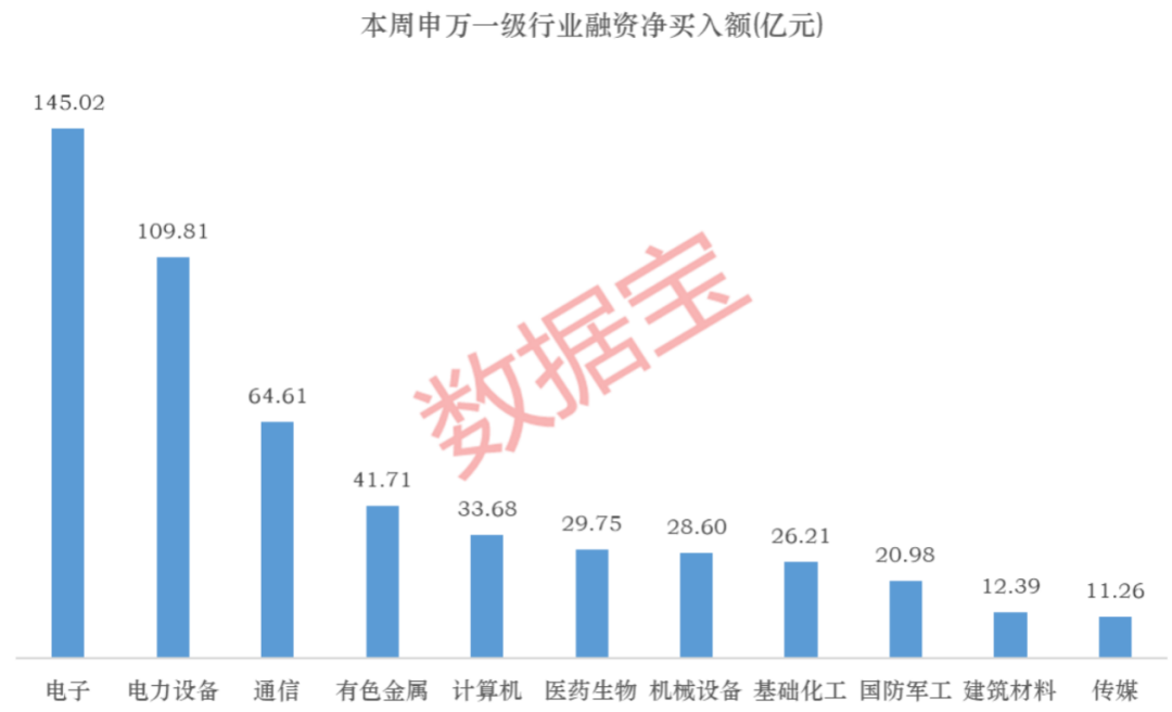 分行业看,电子、电力设备板块分居第一、第二名,融资净买入额分别为145.02亿元、109.81亿元;通信板块排名第三,融资净买入额64.61亿元;有色金属、计算机板块随后,净买入额均在30亿元以上。