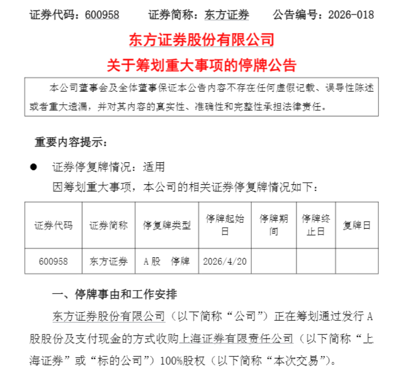 4月19日,东方证券最新公告,公司正在筹划通过发行A股股份及支付现金的方式收购上海证券有限责任公司100%股权。鉴于该事项存在不确定性,为维护投资者利益,避免股价异常波动,公司A股股票将于4月20日开市起停牌,预计停牌时间不超过10个交易日。