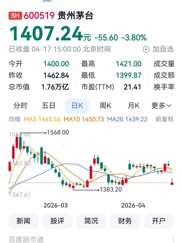 4月17日,贵州茅台报收1407.24元,市值1.76万亿元,列A股上市公司市值第六,前五分别为工商银行2.54万亿元、农业银行2.48万亿元、中国石油2.06万亿元、宁德时代2.05万亿元、建设银行2.03万亿元。