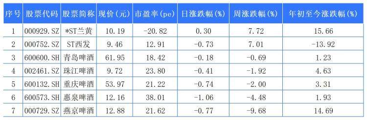 *ST兰黄以7.72%列啤酒股周涨幅第一