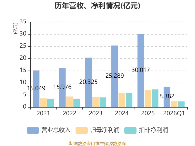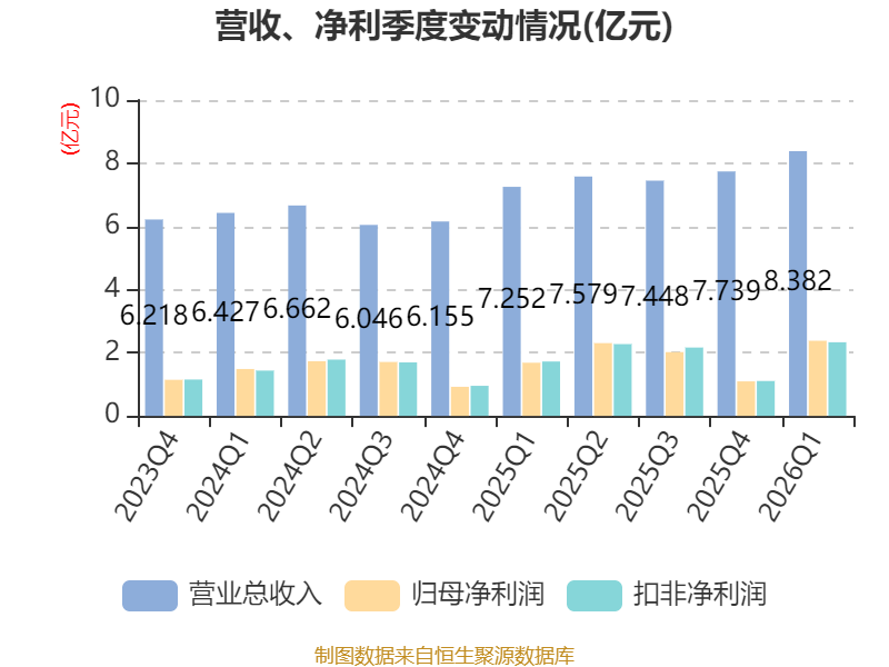 中证智能财讯大豪科技(603025)4月20日披露2026年第一季度报告。公司实现营业总收入8.38亿元,同比增长15.58%;归母净利润2.38亿元,同比增长41.32%;扣非净利润2.33亿元,同比增长35.40%;经营活动产生的现金流量净额为1.18亿元,同比增长1641.60%;报告期内,大豪科技基本每股收益为0.21元,加权平均净资产收益率为8.37%。