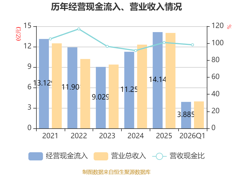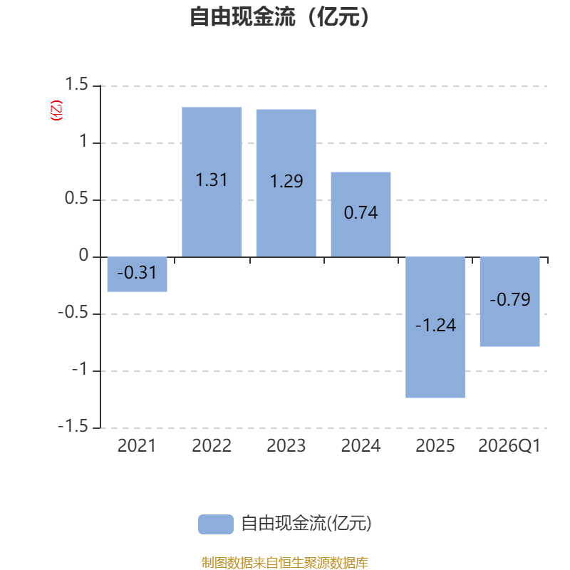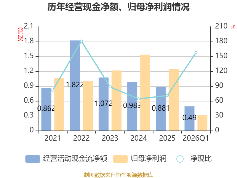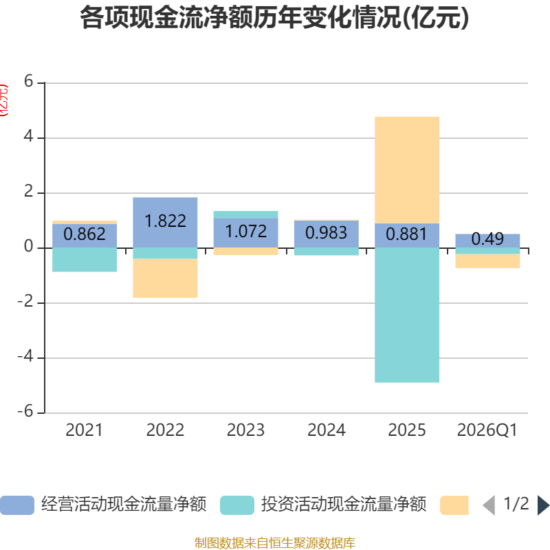 截至2026年一季度末,公司经营活动现金流净额为4901.86万元,同比下降27.03%;筹资活动现金流净额-5085.13万元,同比减少1962.36万元;投资活动现金流净额-2409.23万元,上年同期为-1251.94万元。