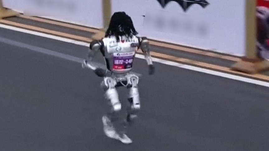 此外,4月19日,2026北京亦庄人形机器人半程马拉松赛场上,出现了一个戴着头发的机器人:遥控-048,为行者队的行者泰山E1机器人。网友戏称“半夜送外卖要被吓死”。