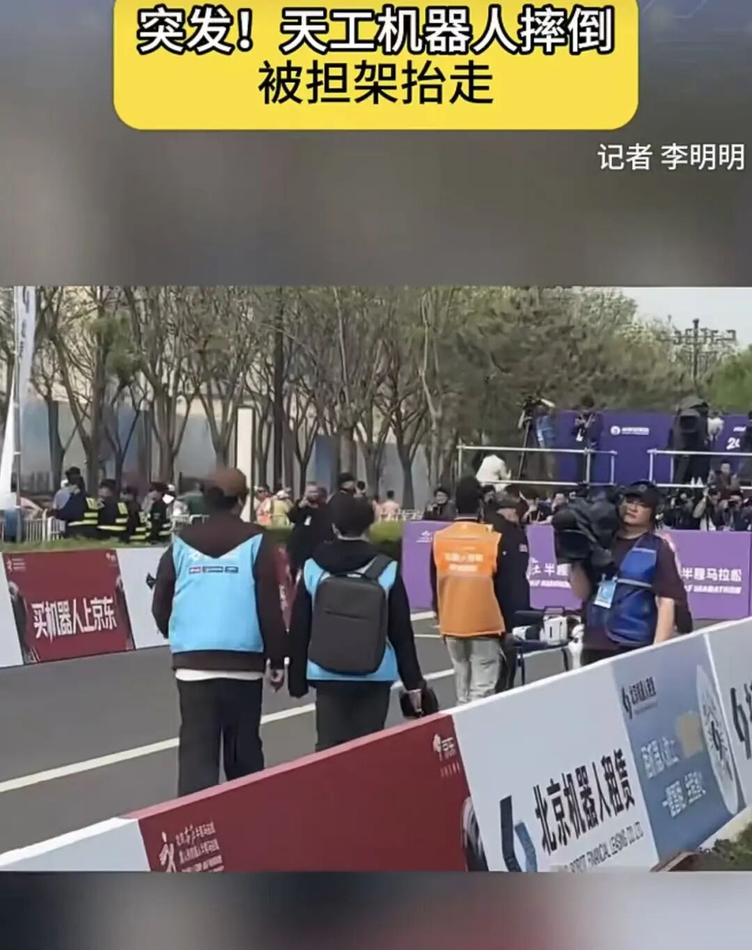 值得一提的是,比赛过程中还有机器人状况百出。“天工”机器人意外摔倒了,被担架抬走。