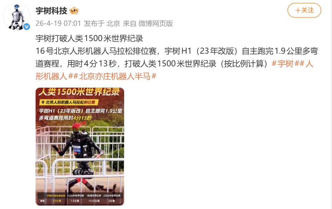 同日稍早前,宇树科技发布消息称,16号北京人形机器人马拉松排位赛,宇树H1(2023年改版)自主跑完1.9公里多弯道赛程,用时4分13秒,打破人类1500米世界纪录(按比例计算)。