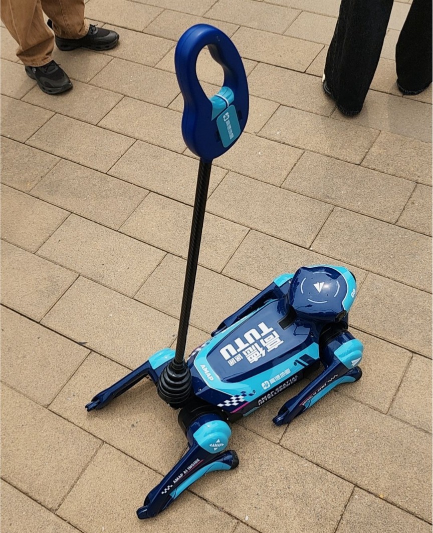 高德也首次参赛并公开了首款具身机器人——四足智能导盲犬“途途”。这款搭载高德自研ABot全栈具身技术体系的四足机器人,在无人工干预的条件下,自主引导一位视障大学生完成了动静态避障、穿越窄道、避让突发干扰、自主寻找补给站等一系列城市道路级挑战。